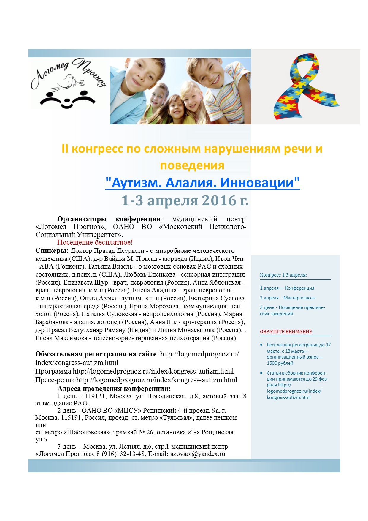 Сайт мероприятия: www.logomedprognoz.ru/index/kongress-autizm.html